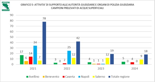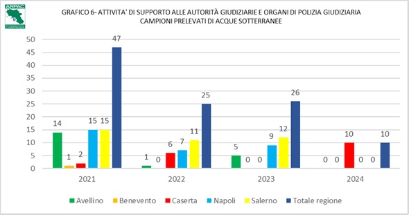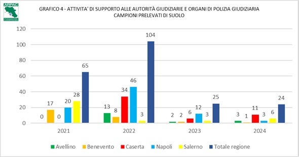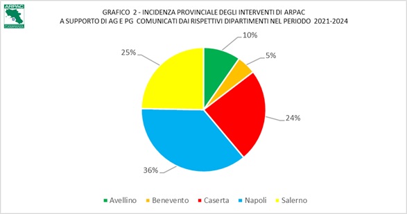 I dati innanzi rappresentati, relativi ai comunicati diffusi a mezzo stampa, si completano con quelli trasmessi dai Dipartimenti Provinciali Arpac, in ordine a tutte le numerosissime attività svolte dal personale agenziale, su richiesta dell’Autorità Giudiziaria o dalla Polizia Giudiziaria. Rispetto ai dati riportati dagli organi di stampa, queste informazioni evidenziano una prevalenza di interventi eseguiti nella provincia Napoli (36%), un sostanziale equilibrio di quelli eseguiti nelle province di Caserta (24%) e Salerno (25%); seguono le province di Avellino (10%) e Benevento (5%).