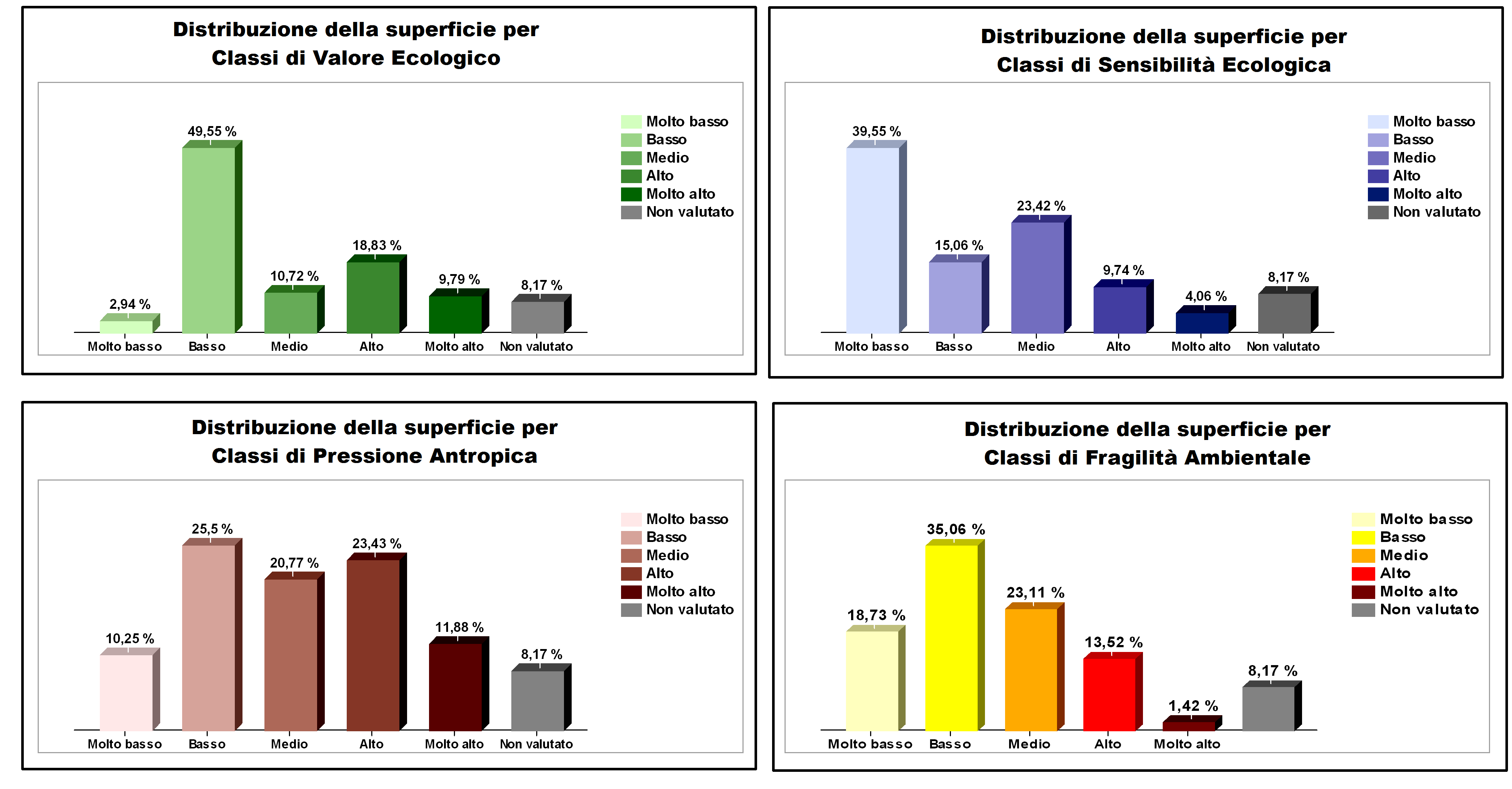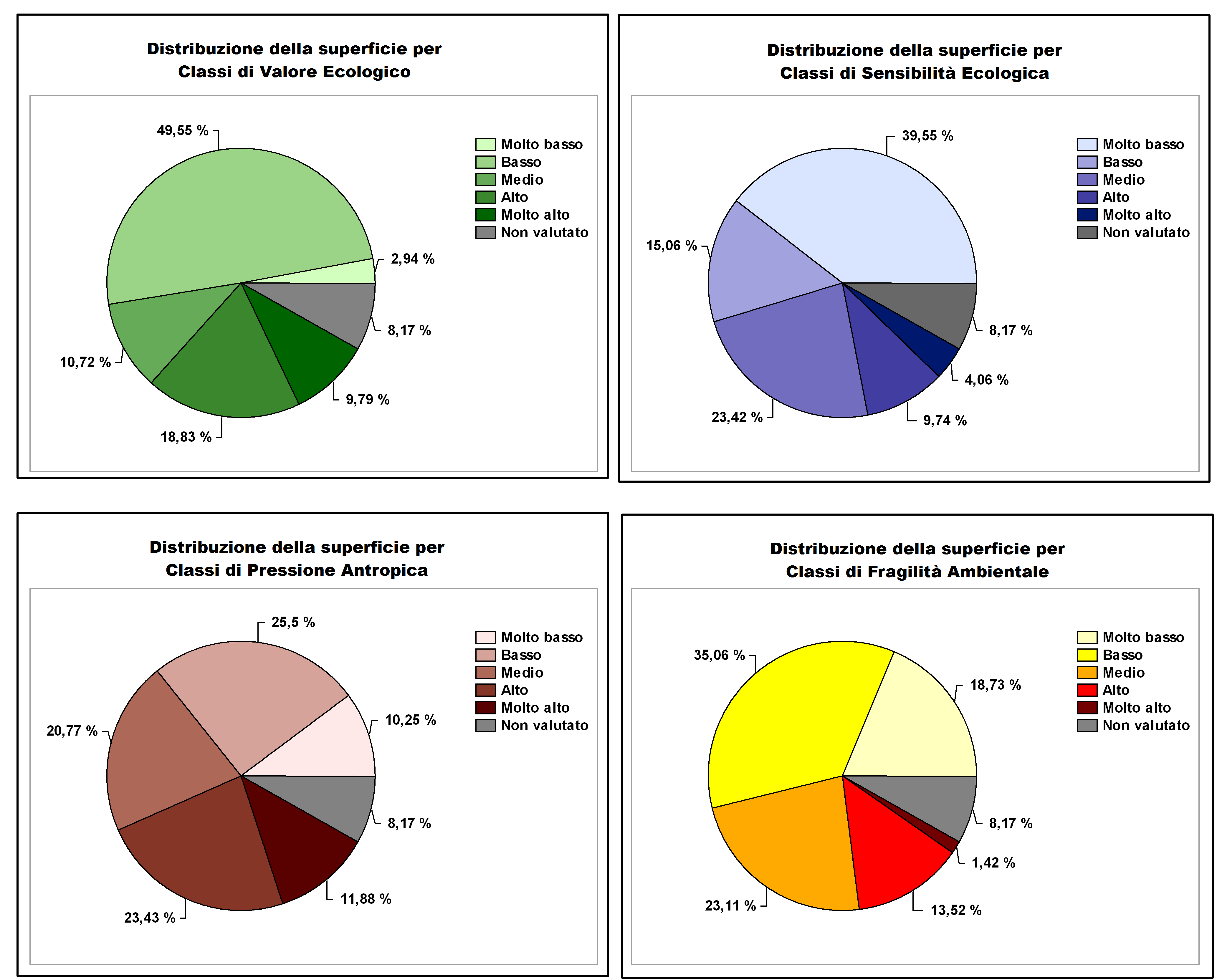 | Fragilità Ambientale | La Fragilità Ambientale deriva dalla combinazione di Sensibilità Ecologica e Pressione Antropica.Evidenzia le aree più sensibili e contemporaneamente più “pressate” dal disturbo antropico. |