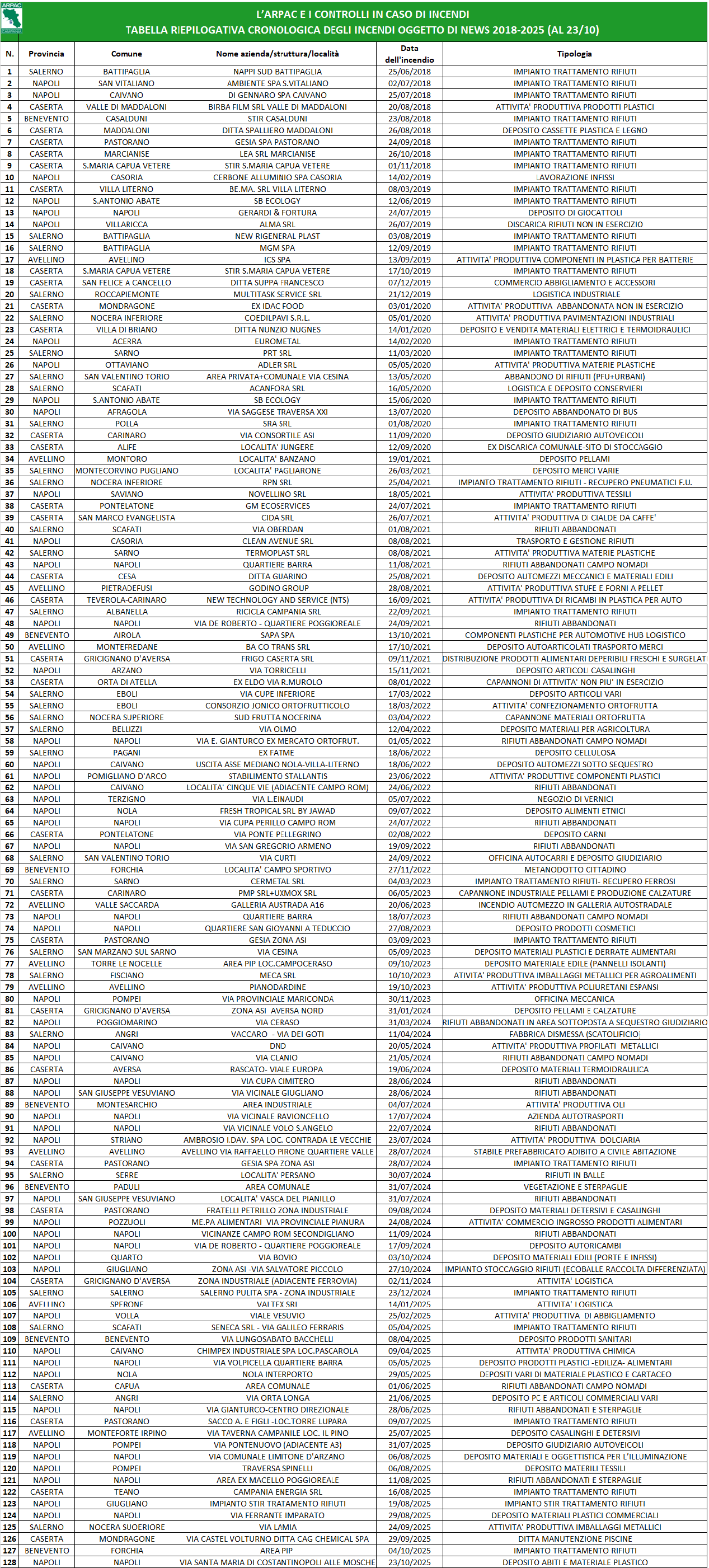 Nella tabella sotto riportata, che è possibile scaricare al seguente link, sono riportati in ordine cronologico le attività di controllo eseguite da ARPAC in occasioni di incendi in cui l’Agenzia è intervenuta a far data dal 2018 e che sono stati oggetto di pubblicazione nelle news.