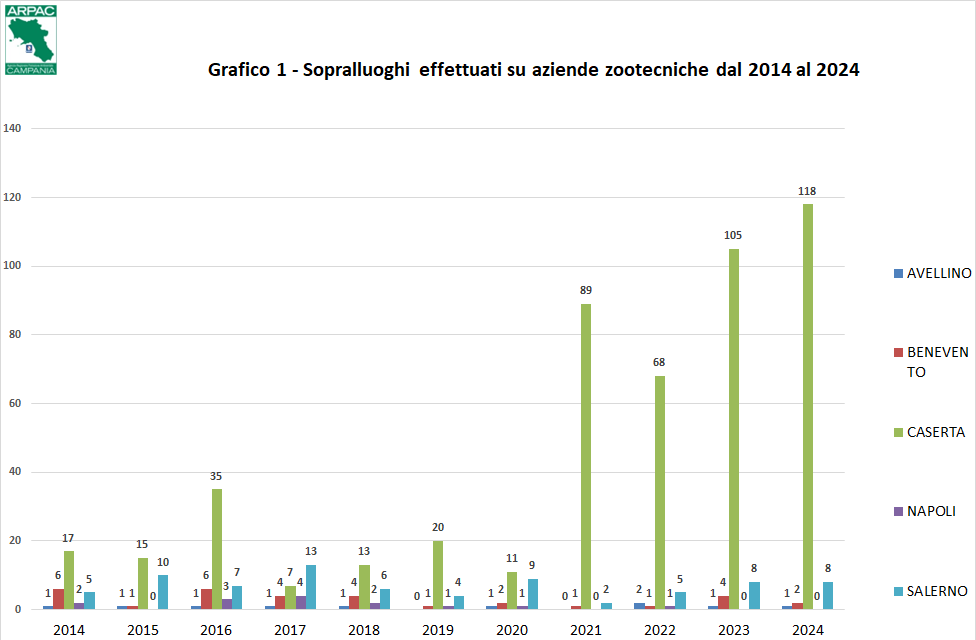 Controlli presso aziende zootecniche per la corretta gestione ambientale dei reflui: nonostante le funzioni ed i compiti amministrativi relativi alle comunicazioni delle attività di spandimento dei reflui, in applicazione dell'art. 5 della Legge Regionale n. 14/2010 "Tutela delle acque dall'inquinamento provocato dai nitrati di origine agricola", siano di competenza dei Comuni, le Aree Territoriali dei Dipartimenti Provinciali dell’ARPAC, su istanza dei Comuni, di altri Enti e soprattutto delle Forze dell'ordine, effettuano sopralluoghi ed ispezioni a supporto. A tal proposito stante la complessità della materia, in applicazione dell'art. 4 della stessa L.R. n.14/2010, è stato predisposto dalla regione Campania di concerto con ARPAC nel 2014 un Piano di Monitoraggio e Controllo per le attività di utilizzazione agronomica degli effluenti di allevamento e delle acque reflue. Nel corso della esecuzione di tale Piano le strutture dipartimentali provinciali hanno effettuato tra il 2015 e il 2018 sopralluoghi su un campione di aziende zootecniche, ubicate in 34 Comuni, suddivisi per Provincia, individuati tra quelli a maggiore densità zootecnica. Sempre nell'ambito di tale Piano, l'Agenzia, tramite le strutture dei dipartimenti provinciali, ha effettuato il monitoraggio delle acque superficiali di due corsi d'acqua in provincia di Caserta ed altrettanti in provincia di Salerno. I campionamenti di acqua eseguiti sono stati funzionali alla valutazione di parametri chimico-fisici, microbiologici e isotopici connessi specificamente all'inquinamento da nitrati. La scelta di tali corsi d'acqua è stata effettuata tra quelli non compresi nel novero dei corsi già monitorati e tra quelli localizzati in aree a forte presenza di attività zootecniche.