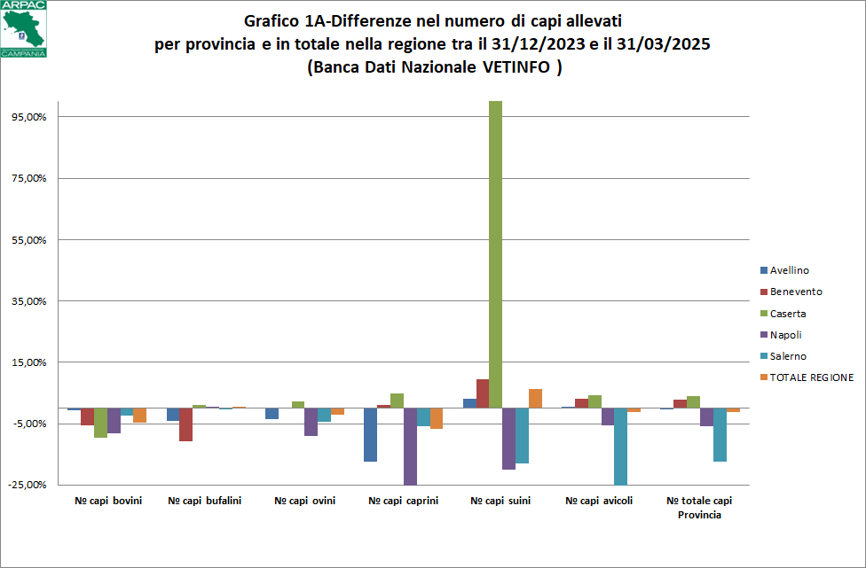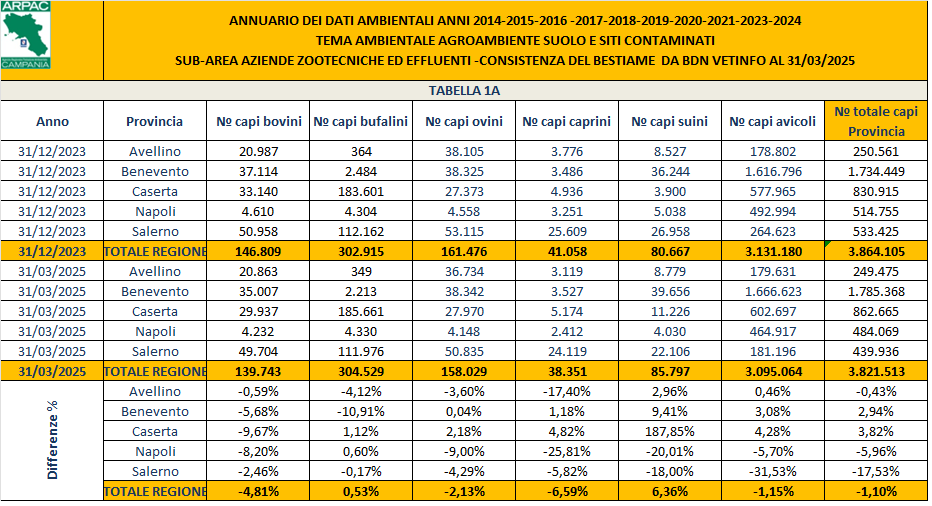 Nel ricco quadro nazionale la zootecnia campana si caratterizza per l'elevato numero di capi ed aziende bufaline, che si concentrano soprattutto nelle provincie di Caserta e Salerno , in aziende agricole spesso di tipo intensivo o in allevamenti "senza terra". Queste peculiarità e la conseguente forte concentrazione di animali in determinati comprensori fanno sì che, in regione Campania, la fertirrigazione attuata con reflui zootecnici, sia una pratica alquanto diffusa ma rischiosa per l'ambiente. Tenendo conto dei coefficienti di produzione riportati in letteratura, si stima (fonte Assessorato Agricoltura – gennaio 2013) che ogni anno si producono sul territorio regionale 3.795.530 m di liquami zootecnici che per la maggior parte sono utilizzate per fini agronomici. Nelle tabelle 1A ed 1B sottostanti, compilate con i dati estratti dalla Banca Dati Nazionale del settore veterinario aggiornati al 31/03/2025, si evince chiaramente quali siano state le variazioni, sia in termini di numero di capi allevati sia in termini di aziende di allevamento, dal mese di Dicembre 2023 al mese di Marzo 2025. Questa analisi (con i relativi andamenti) risulta ancora più chiara dai successivi grafici 1A ed 1B
