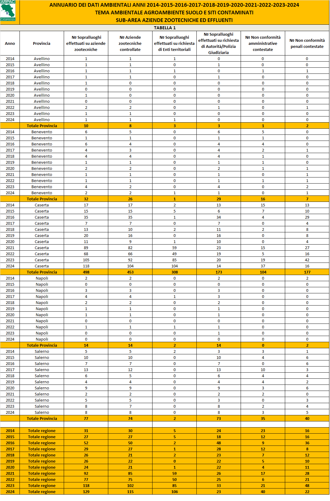 Nell’ambito della suddetta convenzione sono affidate ad ARPAC attività sia tecniche di controllo amministrativo delle comunicazioni di utilizzazione agronomica dei reflui zootecnici, ricadenti sia in zone ordinarie che in zone vulnerabili ai nitrati di origine agricola, sia di campo, attraverso l’acquisizione ed il successivo controllo analitico di campioni di suolo per la determinazione dei seguenti parametri: Azoto totale, Fosforo totale, Rame, Zinco e Sodio scambiabile